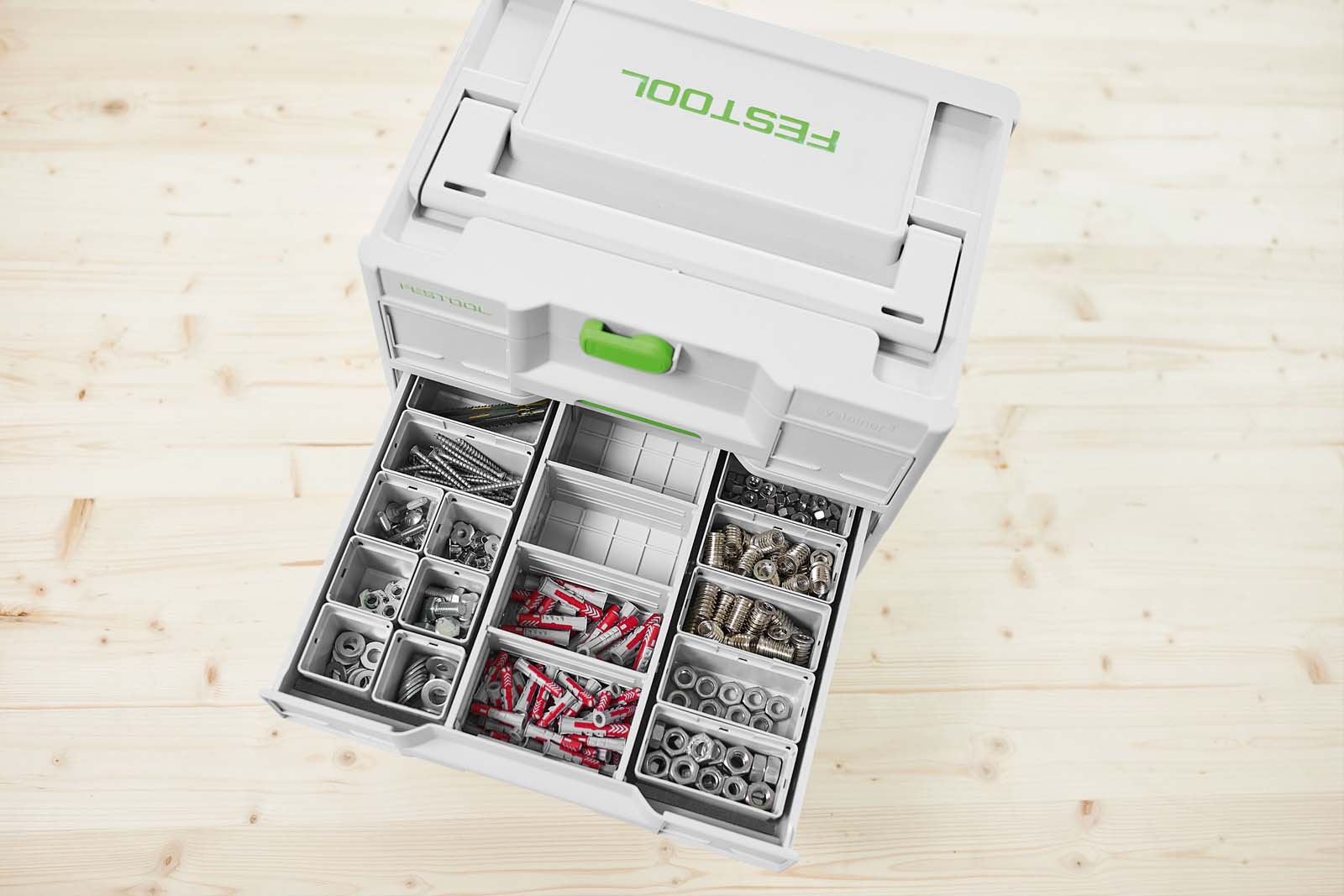 Zestaw wyjmowanych pojemniczków składa się z łącznie 13 pojemniczków w dwóch różnych rozmiarach – idealnie dopasowanych do szuflad Sortainera³ lub Systainera³ Combi. Dzięki wyjmowanym pojemniczkom drobne elementy, takie jak gwoździe, kołki czy wkręty, są zawsze widoczne i łatwo dostępne – w celu inteligentnego uporządkowania zawartości i zaoszczędzenia czasu w miejscu pracy.